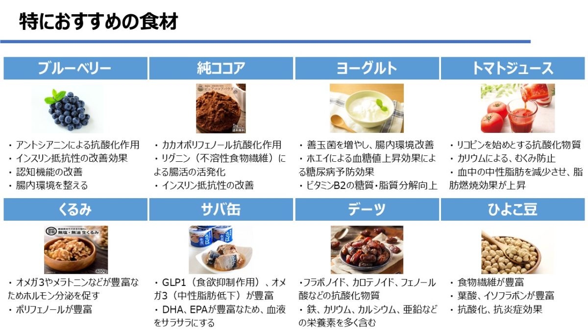 意識的に摂取したいものは、全粒穀物、ナッツ類(くるみ)、ショウガ、青魚、果物(ベリー類)、オリーブオイル、ターメリック、アボガド、発酵食品、緑の濃い食べ物(ほうれん草、キャベツなど)、緑黄色野菜(カボチャ、黄ピーマン、豆、ニンジンなど)といった抗酸化&抗炎症食品です!特におすすめなのが、ブルーベリーやヨーグルト、トマトジュース、くるみやサバ缶です。デーツやひよこ豆をおやつで食べるのも良いですね!