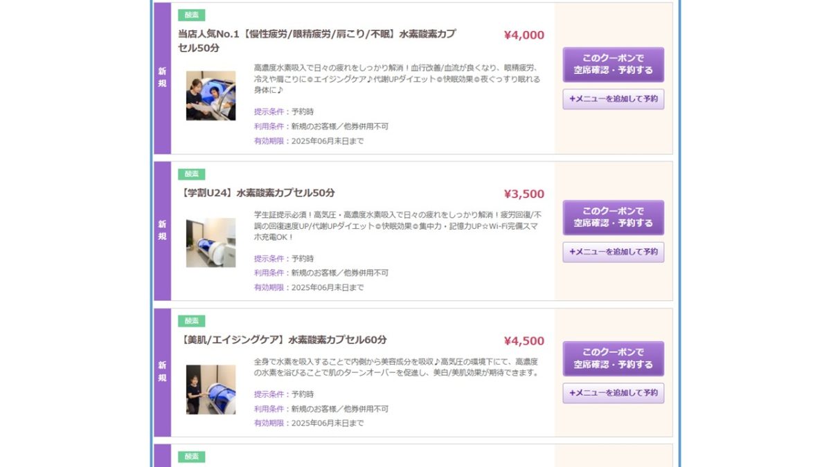 水素カプセルのお得な割引・クーポンもございますので、ご予約お待ちしております♪